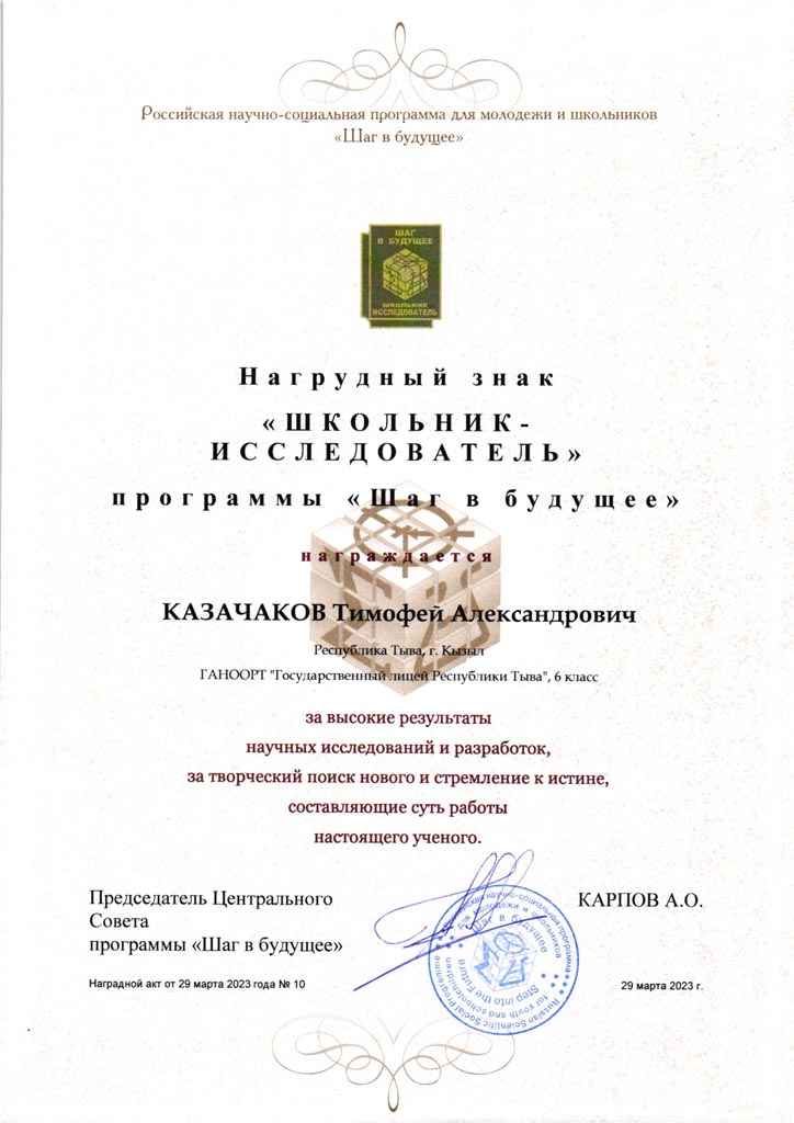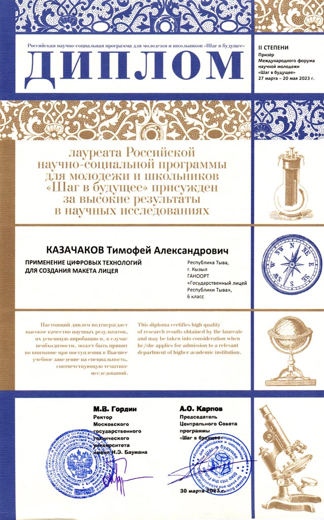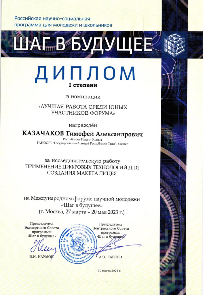 Казачаков Тимофей стал обладателем Диплома I степени в номинации «Лучшая работа среди юных участников форума» за исследовательскую работу «Применение цифровых технологий для создания макета лицея» на международном форуме научной молодежи «Шаг в будущее» 2023 г. А так же награжден нагрудным знаком «ШКОЛЬНИК ИССЛЕДОВАТЕЛЬ» программы «Шаг в будущее»