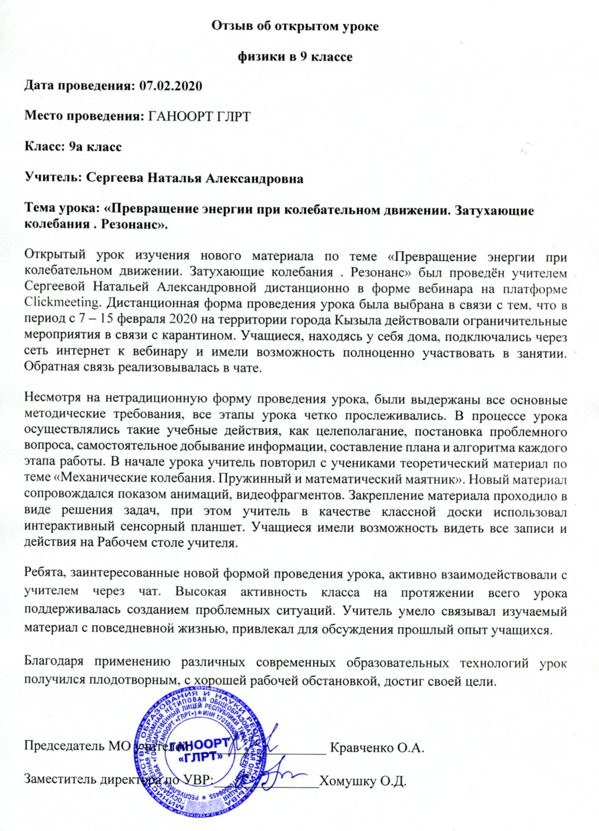 | 2 | Открытый урок -Вебинар по физике 9 класс | 07.02.2020 г. |