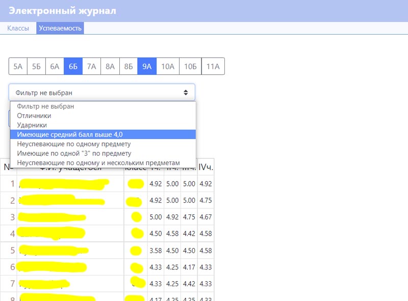 Электронный журнал дает возможность мониторинга показателей успеваемости ежеурочно, ежедневно, ежемесячно и т.д., по разделам, по темам, по предметам обучения.